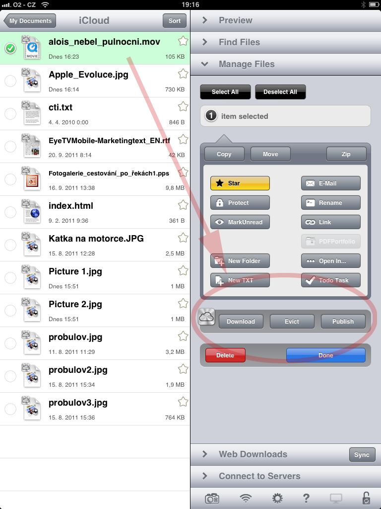 2 Jakub: Musíš mít verzi 3.9.1 pro iPhone (je v CZ i US AppStore). Dáš IMPORT PICTURES, zvolíš třeba fotku z fotoalba, pak vlezeš do MY DOCUMENT a máš jí zkopírovanou v knihovně GoodReaderu vedle dalších v telefonu lokálně uložených souborů. Dáš vpravo nahoře ACTIONS, vlevo potvrdíš u souboru puntík, dáš COPY nebo MOVE a naviguješ do adresáře iCloud a potvrdíš dole vpravo COPY či MOVE. Dáš DONE, vlezeš do iCloud a vidíš, cos tom už nacloudoval. Seš ve frontě iCloud, dáš ACTION a zvolíš soubor puntíkem a pak jdou volit funkce DOWNLOAD (z iCloudu) či EVICT (mazání z paměti iPhone, v iCloudu zůstane). Funkce PUBLISH jak jsem psal u iPhone není pouze u iPadu. Obě tlačítka jsou v druhé části tlačítek – zvol šipky doprava.