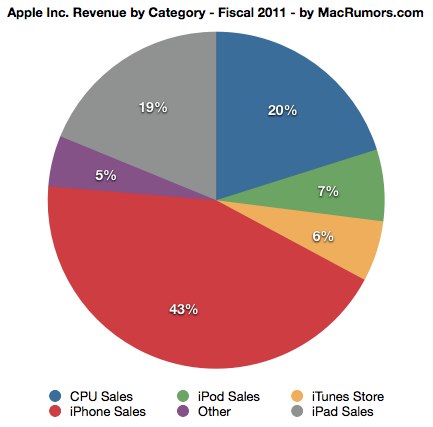 Apple ve čtvrtém fiskálním období roku 2011 prodal 4,89 milionů počítačů Macintosh, což je 26% nárůst oproti stejnému období v loňském roce. Počet prodaných iPhone za poslední tři měsíce se zastavil na čísle 17,07 milionů, což představuje meziroční nárůst o 21 procent. Apple prodal pouze 6,62 milionů iPod, což je 27 procentní pokles stejnému období za loňský rok. Apple dokázal prodat 11,12 milionů iPadů, což představuje meziroční nárůst 166%.