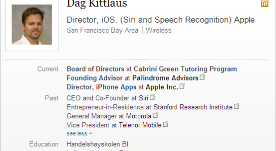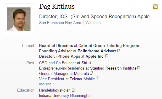 Dag Kittlaus, zakladatel společnosti SRI INternational Artificial Intelligence, opustil společnost Apple, která jeho firmu 28. 4. 2010 společně s ním koupila. Dag společně se třemi společníky Dag Kittlaus (CEO), Adam Cheyer (VP Engineering), Tom Gruber (CTO/VP Design) a Norman Winarsk vyvinul aplikaci SIRI, kterou začal nabízet v iTunes App Store a pokračoval také na vývoji pro operační systémi BlackBerry a Android. Apple však firmu koupil a SIRI stáhl z iTunes App Store proto, aby ji mohl použít v iPhone 4S. Dag a jeho další kolegové pracovali v Applu na vývoji SIRI pro iPhone 4S a společně s inženýry z Applu vývoj také úspěšně dokončili. Nyní však Dag Kittlaus odešel z Applu na základě vzájemné dohody, nikdo však netuší kdo byl iniciátorem jeho odchodu.