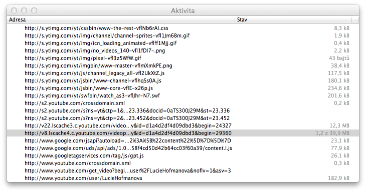 Me zase prijde slozitejsi na kazdou blbost, kterou zvladnu par klikama, hledat nejakou aplikaci (a marne vzpominat, jak ze se to jmenovala, az ji budu chtit za pul roku zas pouzit). V okne activity si proste oznacim video, ⌘+C, v okne downloads pak ⌘+V a stahuju..