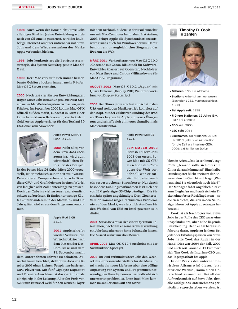 Nejen těm, co ovládají německý jazyk, jistě udělalo radost elektronické vydání publikace „MACWELT – 15 let se Stevem Jobsem“. Na úctyhodných 450 stránkách je popisována poslední půldruhá dekáda firmy Apple, tj. od doby, kdy se Jobs znovu vrátil do Apple. Nejedná se sice o originální vydání napsané dnes, ale je to spíše kompilace vybraných milníků z této doby, co vyšly dříve v tištěné podobě německého časopisu Macwelt (svět Applu). Publikace je dostupná v Apple AppStore jako mimořádné číslo aplikace Macwelt a pro majetele českého účtu je cena 4,99 €. V přiložené fotogalerii je osm náhodně vybraných ukázek z časopisu.