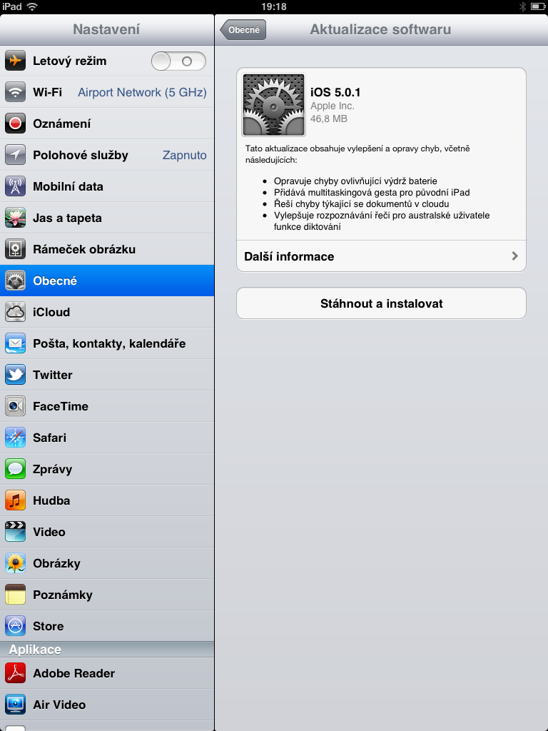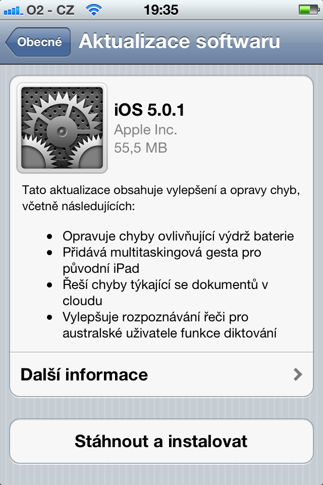 Apple právě vydal ohlášený opravný update iOS-5.01 s vylepšeními viz. přiložený snímek obrazovky. Podrobné informace v angličtině jsou ne stránkách Apple Inc. na TOMTO ODKAZU.