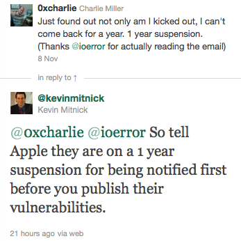 *Reakce Kevina Mitnicka na status Charlieho Millera na sociální síti Twitter.