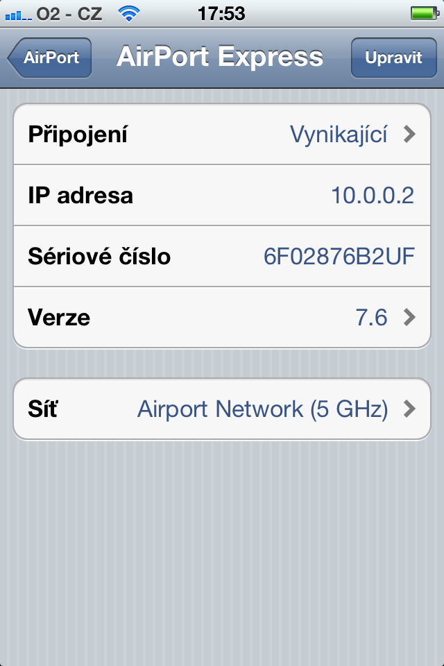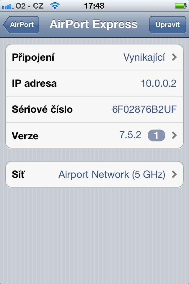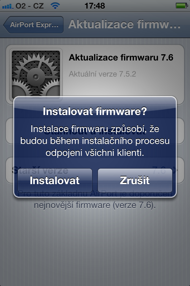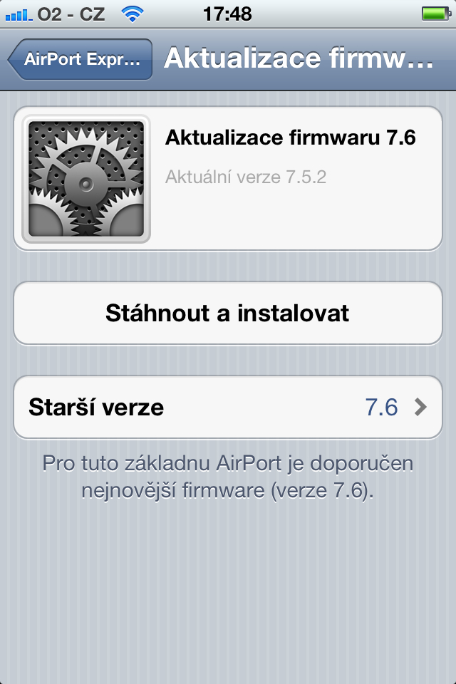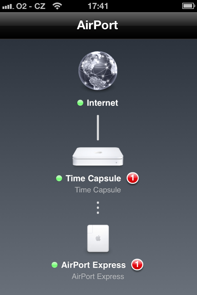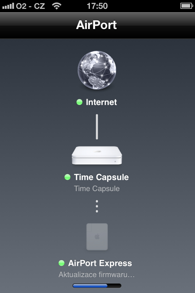 Zhruba před měsícem vyšla iOS aplikace Airport Utility, jejíž recenzi jste si mohli záhy přečíst na tomto serveru. 11.11.’11 vyšla aktualizace verze 7.6 na bezdrátové stanice Apple Time Capsule, AirPort Extreme, a AirPort Express. Byla to tedy jedinečná příležitost premiérově vyzkoušet tuto aplikaci při provádění právě této aktualizace na zmíněných přístrojích poprvé bez použití pevného počítače. Změnu firmware při provádění iPhonem 4S jsem zaznamenal otisky obrazovky do přiložené galerie. Na posledním snímku je vidět historie verzí aktualizací pro daný přístroj. Aplikace Airport Utility je bezplatně ke stažení v Apple AppStore ve verzi pro iPhone/iPod Touch i nativně pro iPad.