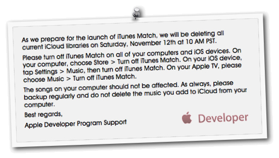 Včera byl zaslán společností Apple mail vývojářům, participujícím na testování plánované služby iTunes Match v rámci jejich Apple Developer Programu. Je v něm sděleno, že v sobotu 12.11.’11 v 10 hodin standartního pacifického času budou smazány současné testovací knihovny budoucí placené veřejné služby Apple iTunes Match.