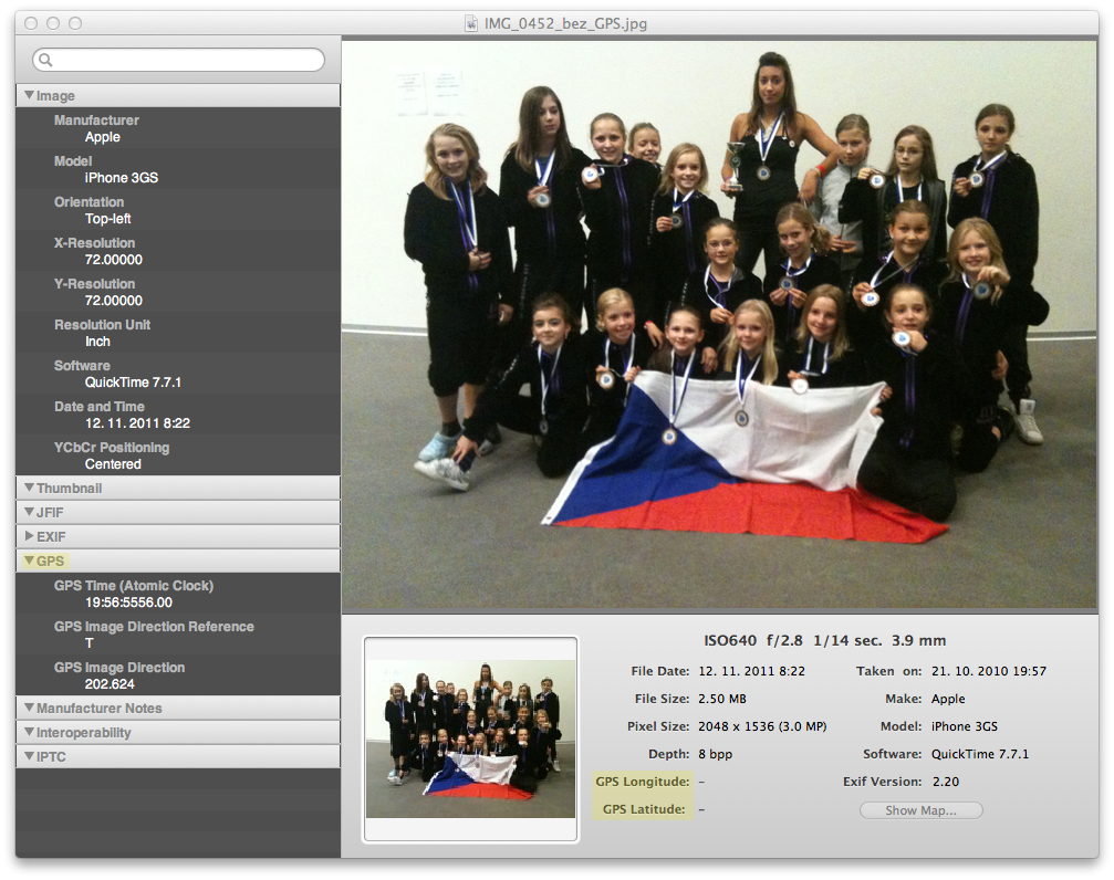 Na následující fotogalerii jsou vidět fotografie s GPS informací a bez ní při analýze programem iExifer, menu volby exportu z iPhoto a pokročilé nastavení v iPhoto.