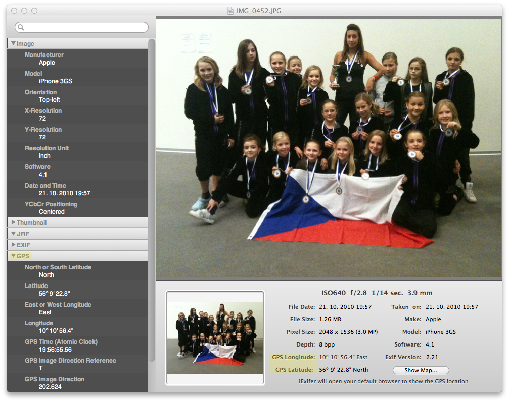 Když ale praktikujeme nejčastější postup přetažení snímku z okna fotek iPhota na plochu s následným vložením např. jako přílohy mailu či nahráním na nějaký server, informace s GPS polohou ve snímku bude. V pokročilém nastavení programu iPhoto sice je volba „k publikovaným fotografiím přidat informace o poloze“, ale to se netýká např. zmíněného přetažení fotek.