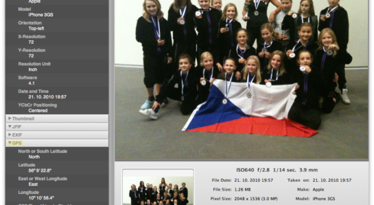 Když ale praktikujeme nejčastější postup přetažení snímku z okna fotek iPhota na plochu s následným vložením např. jako přílohy mailu či nahráním na nějaký server, informace s GPS polohou ve snímku bude. V pokročilém nastavení programu iPhoto sice je volba „k publikovaným fotografiím přidat informace o poloze“, ale to se netýká např. zmíněného přetažení fotek.