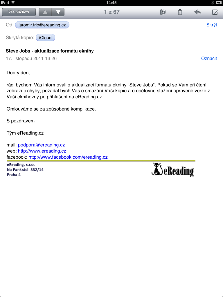 Ve včerejším příspěvku na tomto serveru se v diskusi pod ním odkazovalo na možnost zakoupení nové knihy o Stevu Jobsovi i ve formátu PDF či MOBI, tj. jiném než nabízí Apple iBook Store. Pro případné zájemce, kteří již učinili nákup a stažení, uvádím mail od zástupce ereading.cz, který upozorňuje na akzualizaci zakoupených souborů z důvodu chyby ve vydání. Za sebe uvádím, že formát PDF i EPUB mi připadal v prostředí iOS v pořádku hned od začátku. Jelikož autor mailu nepopisuje blíže problém, nevím zda se chyba netýkala MOBI formátu či diakritiky pod jiným prostředím než iOS.