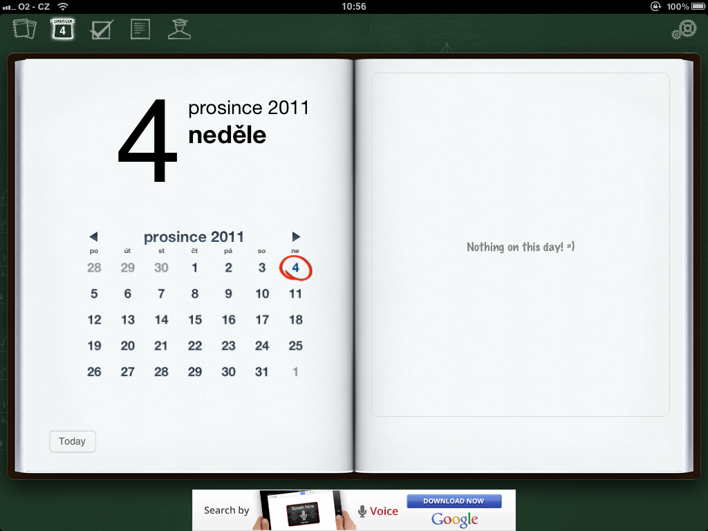 První kategorií v sešitě je kalendář, kam si můžete jednoduše zapsat všechny úkoly, které vás upozorní vámi zvoleným zvukem. Všechno uložené v kalendáři můžete synchronizovat s iCloud, díky čemuž budete mít úkoly vždy aktuální na všech vašich zařízeních.