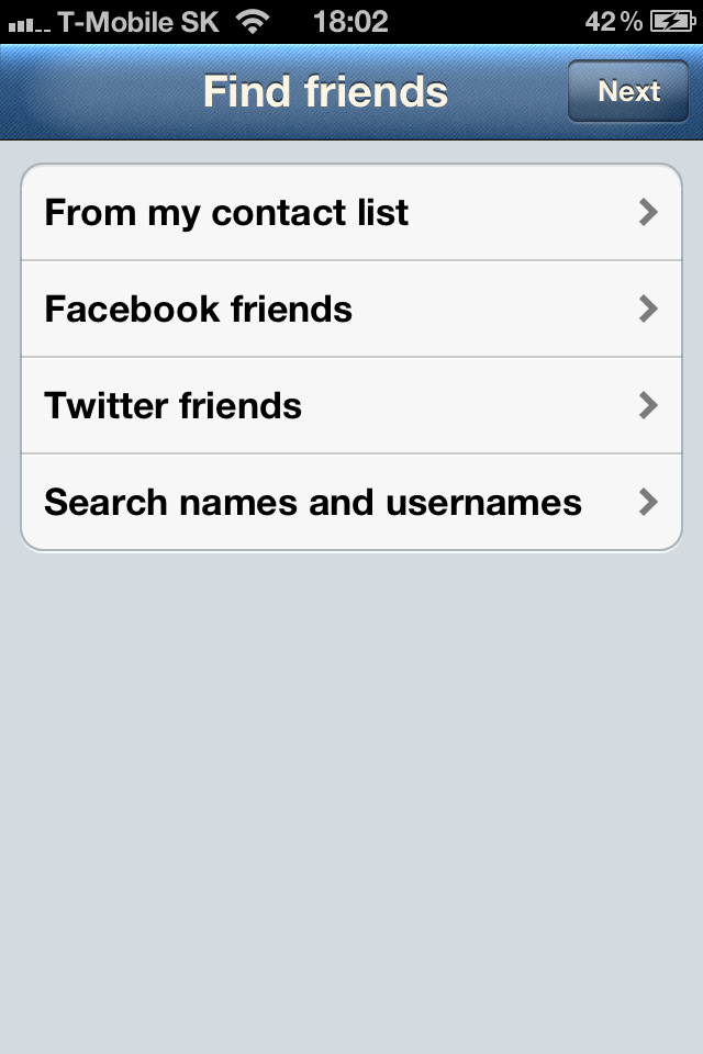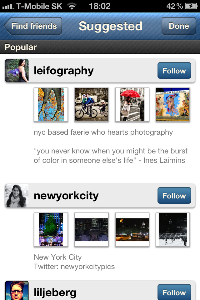 V ďalšom kroku si môžeme ale nemusíme vyhľadať priateľov podľa nasledujúcich kritérií. Z kontaktov, zo sociálnych sietí alebo podľa mena a priezviska. Ak si nezvolíte ani jednu možnosť, ponúknu sa vám na odoberanie fotografií najpopulárnejší používatelia. Taktiež si nemusíte nikoho vybrať a stačí kliknúť len na DONE.