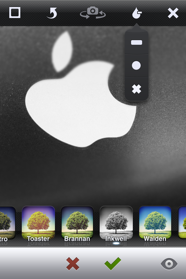 Kliknutím na SHARE sa dostaneme ku hlavnej úlohe Instagramu a tým je fotografovanie a následná úprava fotografie. Na dolnej strane sa nachádzajú ikony s obrázkami stromov. Každá z nich znamená iný farebný filter. Môžeme si vybrať napr. XPro-II, Earlybird, Rise, Amaro, Hudson, Lomo-fi, Sutro, Toaster, Brannan, Inkwell, Walden, Hefe, Nashville a 1977. Horná lišta slúži taktiež na vylepšenie snímky. Ikonou v tvare štvorca môžeme pridať rám. Šípka slúži na otáčanie fotografie o 360 stupňov. Kvapkou sa vyberá ostrosť stredu a rozmazanie bočných strán alebo naopak. Krížikom zrušíme úpravu. Po úprave stačí potvrdiť dole na zelenú čiarku.
