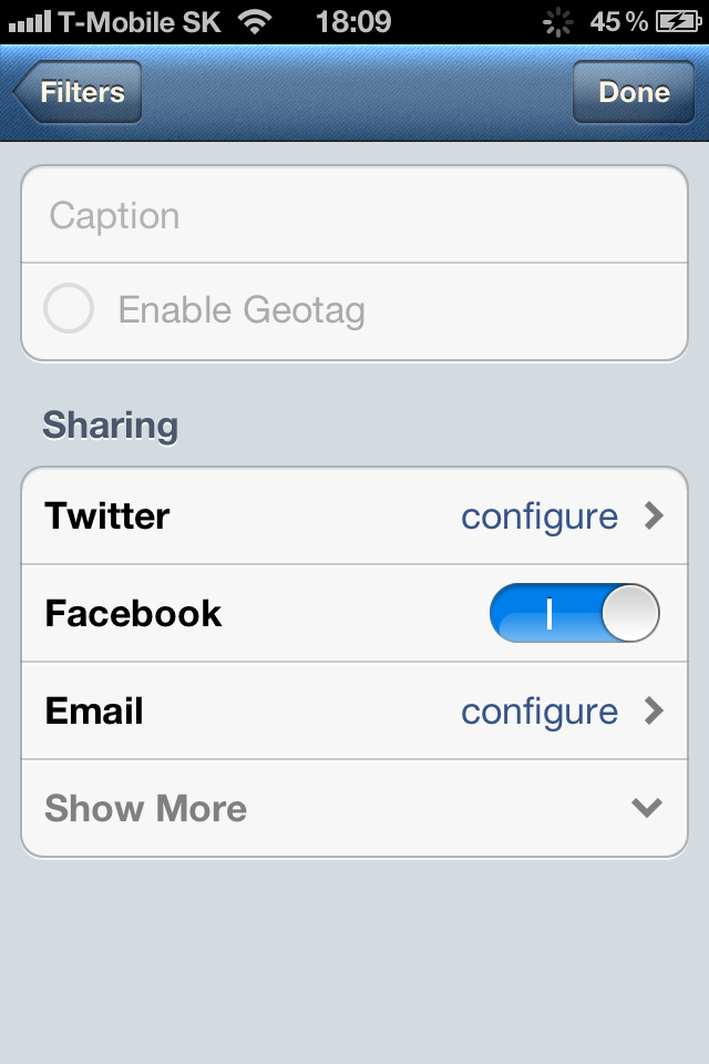 Posledným krokom je výber sociálnej siete alebo e-mailu kde chcete aby bola snímka. Pri prvom zdieľaní je potrebné nakonfigurovanie a zosynchronizovanie aplikácie s vaším sociálnym účtom. Potvrdíte kliknutím na DONE a vaša snímka je na internete. Druhá fotografia pod textom ukazuje ako to vypadá na nástenke Facebooku, pri použití Instagramu.