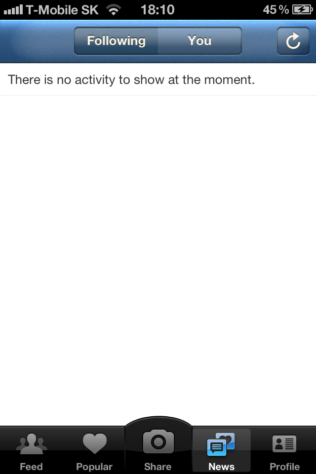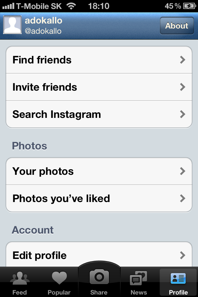 Po registračnej procedúre sa stáva Instagram plne funkčným. Na dolnej lište sa nachádza päť záložiek. FEED nám ukazuje najnovšie fotografie nás a našich priateľov. POPULAR vyberá fotky od používateľov z celého sveta, podľa počtu videní. NEWS časovo zoraďuje aktivitu vás a vašich priateľov. V PROFILE si hľadáte a pozývate vašich priateľov ale taktiež aj upravujete vaše nastavenia.