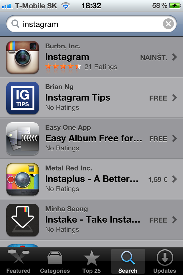 Na úvod začnem inštaláciou, ktorá prebieha normálne cez AppStore. Instagram môžeme buď manuálne vyhľadať, alebo len kliknúť na oddelenie Featured, kde sa aktuálne nachádza úplne na hornej pozícii.