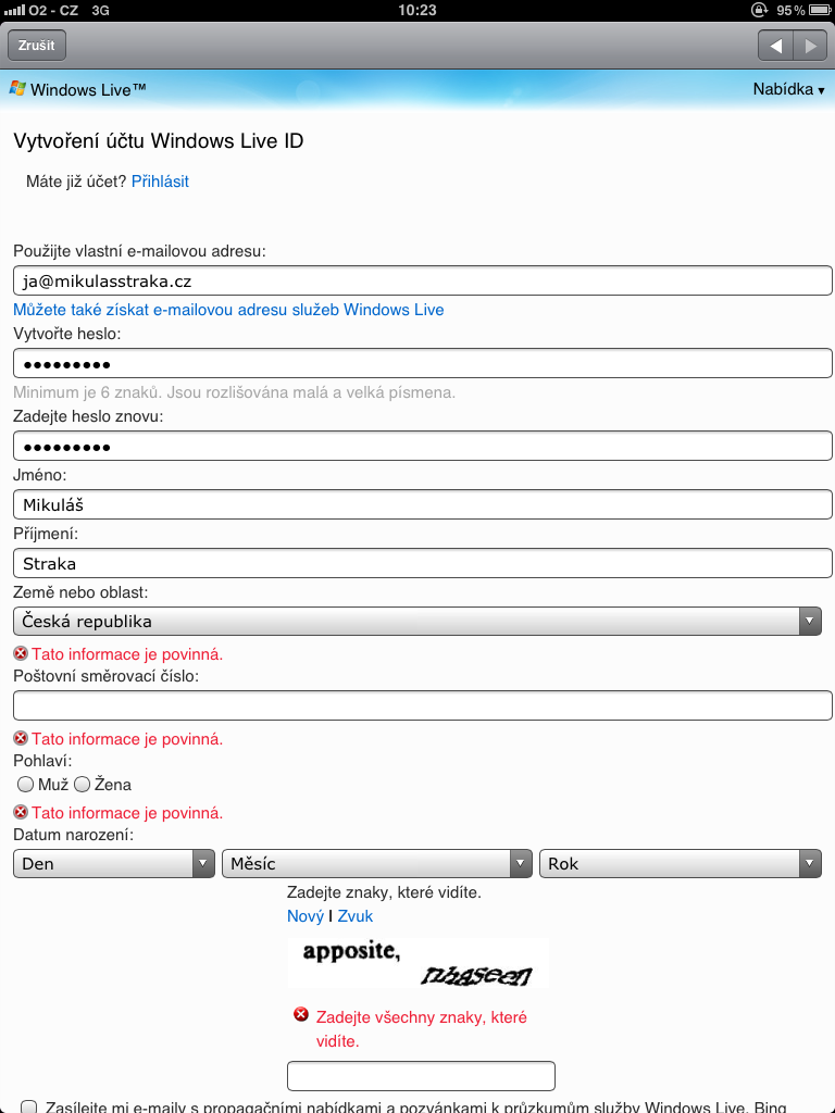 Účet se mi povedlo založit až na podruhé, kdy jsem znovu musel formulář vyplnit. Po přijetí ověřovacího emailu mi nechtěli na mobilní stránce účet ověřit, ale na verzi pro počítač nebylo možné se dostat. Nakonec jsem si musel Windows Live ID vytvořit z počítače.