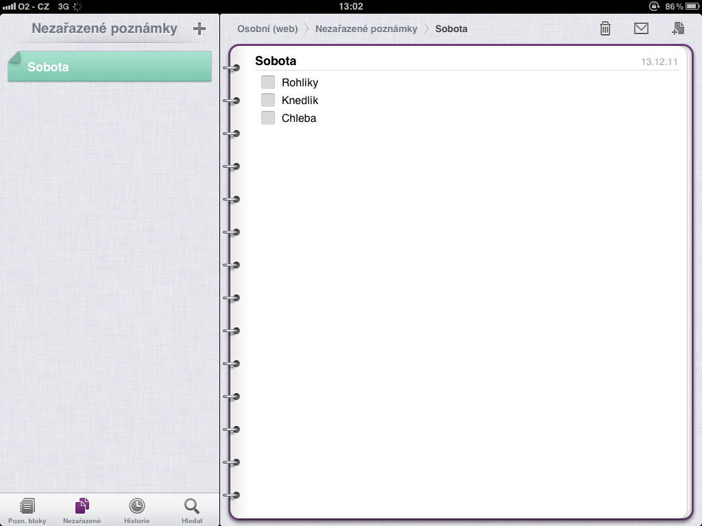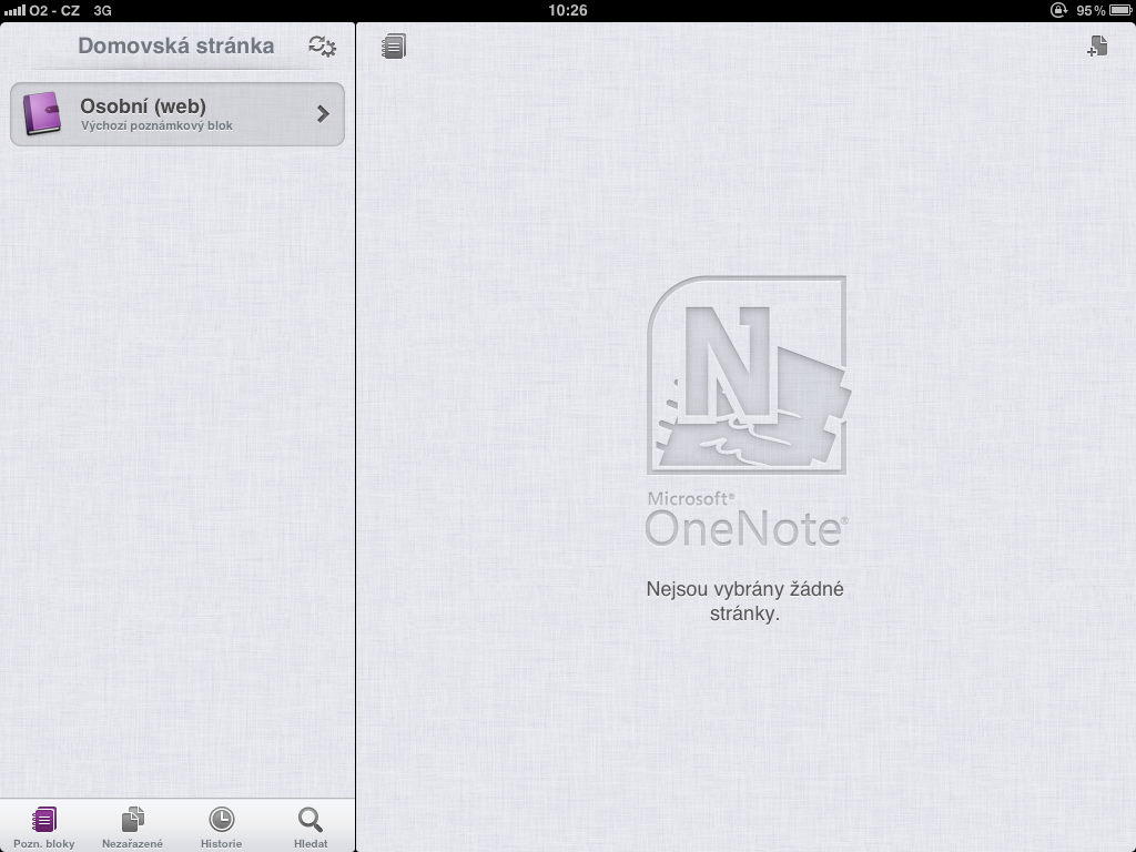 Hlavní strana je rozdělena do dvou panelů. V levém sloupci máte uložené Poznámkové bloky, kde výchozí je už přednastavený. Z nastavení vyplývá, že poznámkové bloky by mělo být možné přidávat, přejmenovat, barevně odlišit a jinak upravit, ale mně se žádnou z funkcí nepodařilo najít.