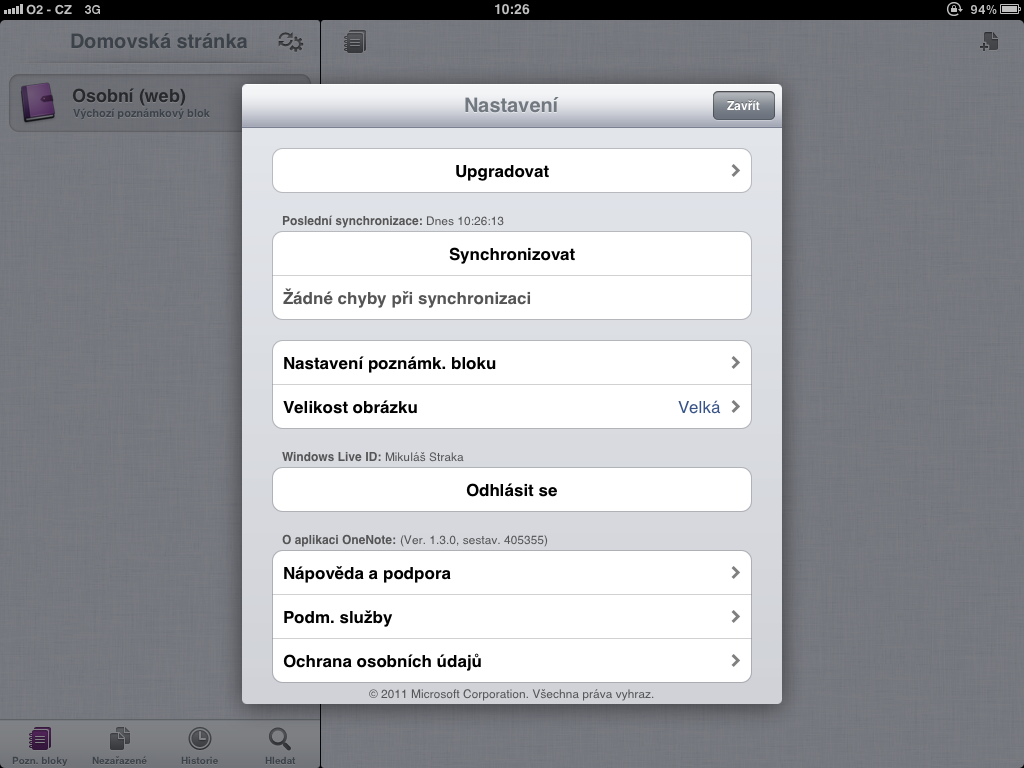 OneNote synchronizuje poznámky s iCloud, neviděl jsem ale, že by synchronizace byla automatická. Manuální synchronizace je možná přes nastavení, kde najdete i spoustu dalších zajímavých funkcí. Také si tam můžete dokoupit volný prostor pro poznámky, takže místo původních 500 povolených budete moci využít neomezeného prostoru.