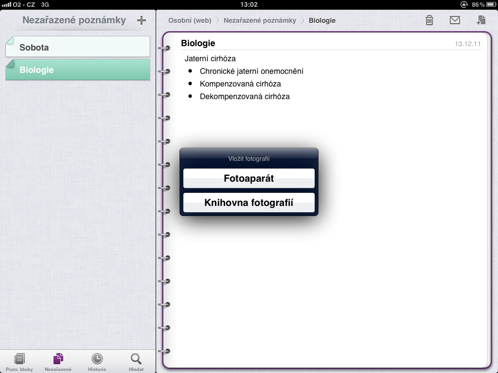Když píšete poznámku, můžete si ji ještě vylepšit o několik zajímavých rozšíření. Nejvíce se mi líbí To-Do list, který můžete vložit kamkoliv do poznámky. Vložit může fotografie z alba vašeho přístroje, nebo můžete nový obrázek přímo vyfotit. Také máte nad klávesnicí rychlou volbu, kde najdete třeba možnost takzvaných odseků, když vypisujete jenom klíčová slova: