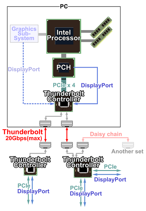 Prenos prostredníctvom tejto technológie kombinuje dva komunikačné protokoly. Prvý je PCI Expres slúžiaci na prenos dát a druhý DisplayPort, ktorý umožňuje preniesť obraz v rozlíšením väčšom, ako je 1080p a 8-kanálový zvuk. Súčasťou celej technológie je čip, umožňujúci prepínať medzi spomenutými dvoma metódami, čím sa zabezpečí prenos prostredníctvom jednoduchého kábla.