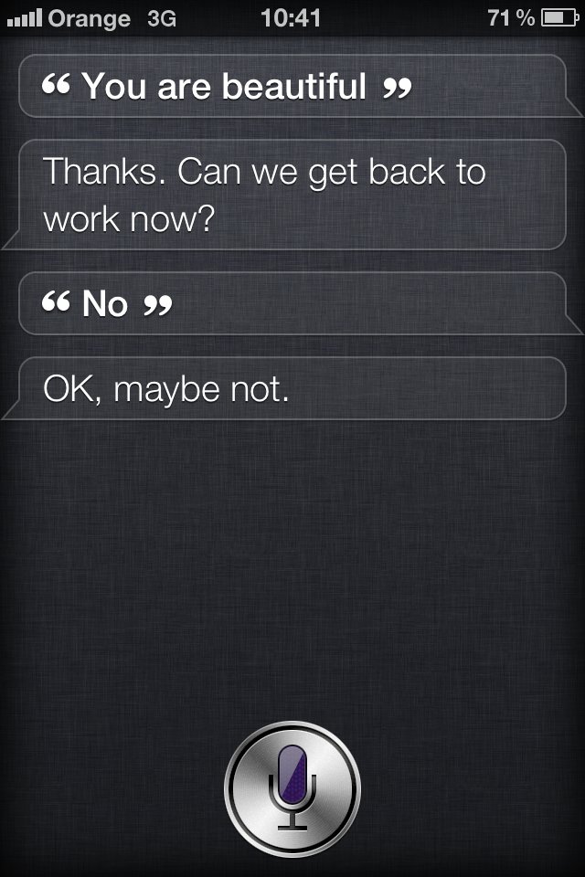 Odpoveď (Siri): Let’s be just friends, OK? – Buďme len kamaráti, OK?