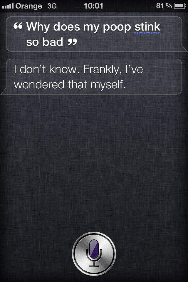 Otázka: Siri, why does my poop stink so bad? – Siri, prečo moje hovienko tak hnusne smrdí?