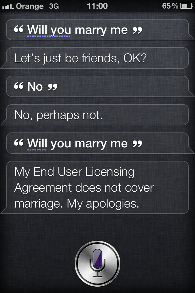 Odpoveď (Siri): My End User Licencing Agreement does not cover marriage. My apologies. – Moja licenčná zmluva nezahŕňa manželstvo. Ospravedlňujem sa.