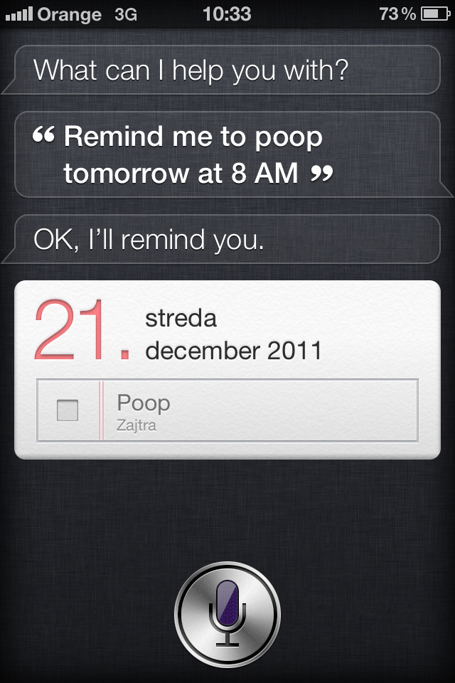 Povel: Remind me to poop tommorow, at 8 A.M. – Pripomeň mi, aby som siel na veľkú potrebu o 8 ráno.
