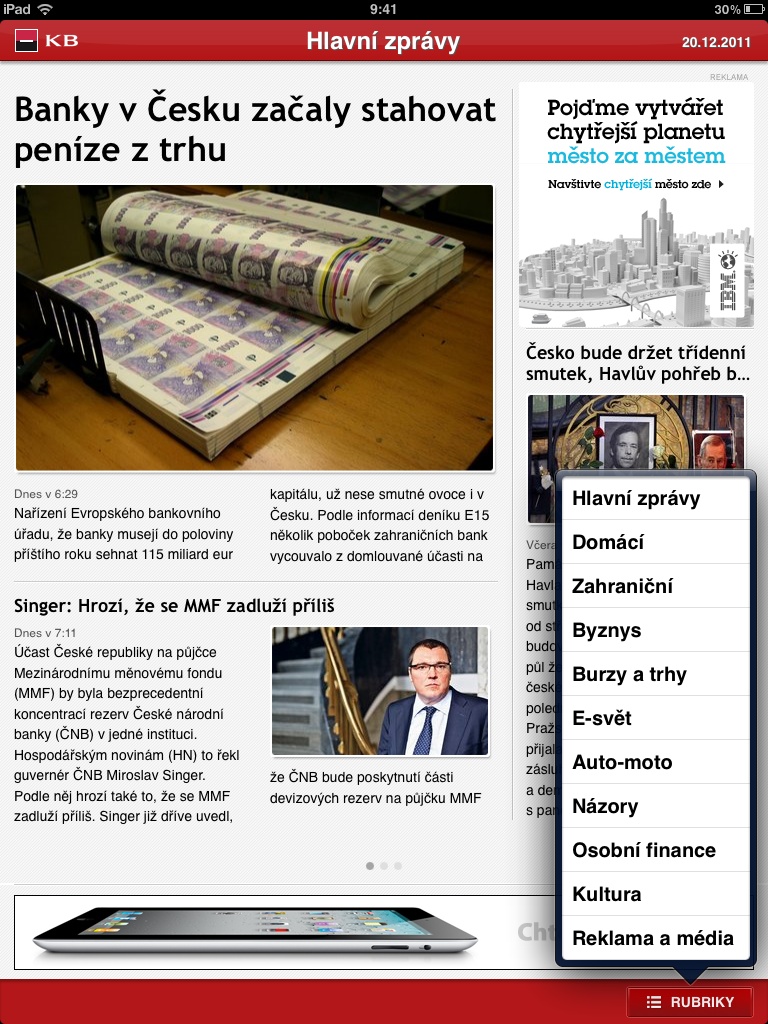 Tisková zpráva: Aplikace E15.cz pro iPad nebo pro iPhone nabízí zdarma pohodlný a rychlý přístup ke zpravodajství a dalšímu obsahu webu E15.cz. Při spuštění aplikace se na iPadu zobrazují hlavní zprávy, pro lepší orientaci lze využít rubriky. Těch je celkem deset: domácí zpravodajství, zprávy ze zahraničí, byznys, burzy a trhy, E-svět, auto-moto, názory, osobní finance, kultura a reklama a média. Články můžete sdílet s přáteli prostřednictvím Facebooku nebo e-mailem.