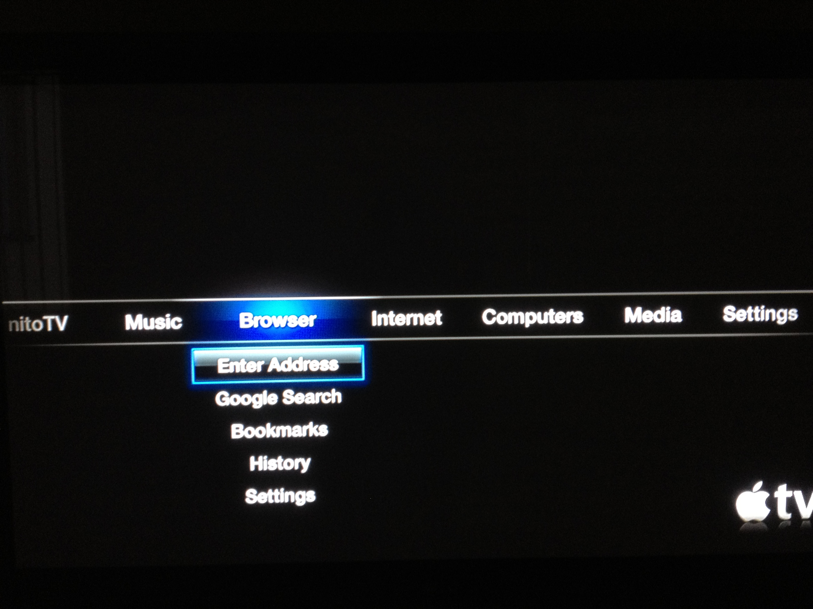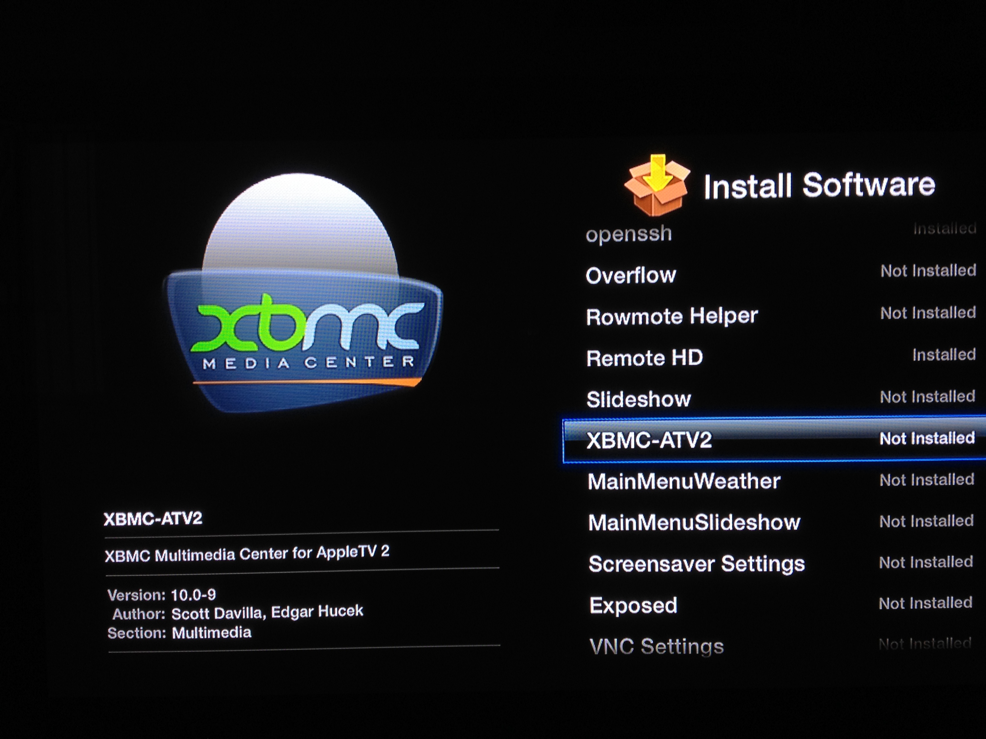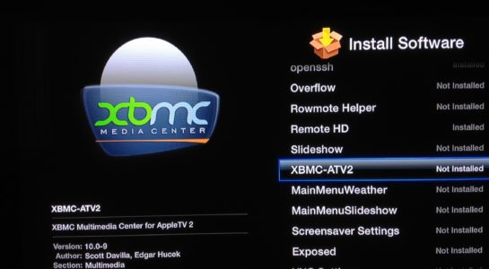 Po Jailbreaknutí Apple TV sa vám v ponuke ukáže nová položka „NitoTV“ cez ktorú môžete pohodlne nainštalovať ďalšie aplikácie okrem iného aj XBMC ako môžete vidieť na obrázku: