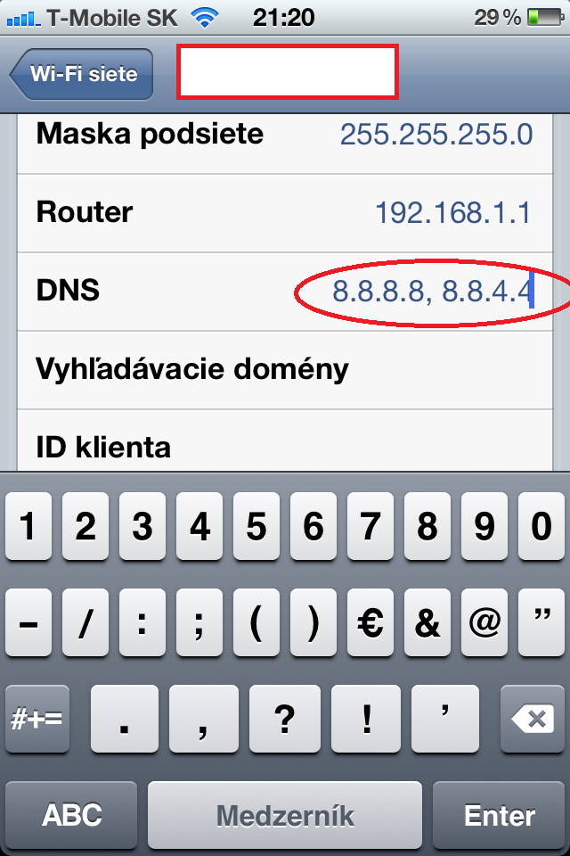 Vložte: Google DNS servery: 8.8.8.8, 8.8.4.4 alebo OpenDNS servery: 208.67.222.222, 208.67.220.220