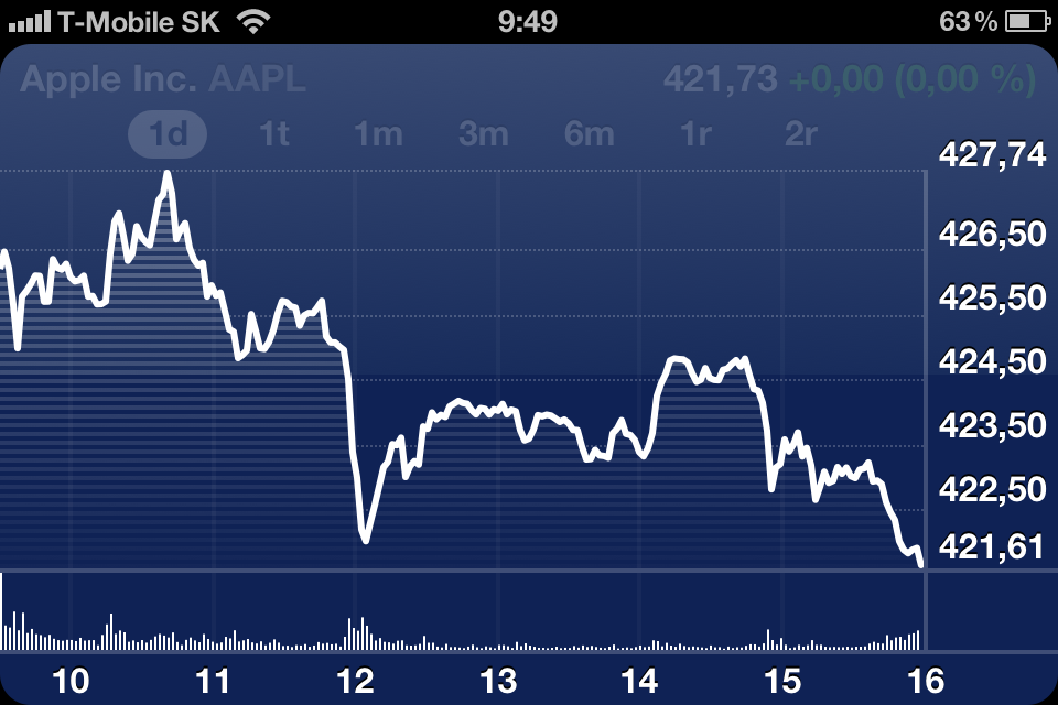 Akcie společnosti Apple Inc. dosáhly během včerejšího dne na historické maximum, které zatím držel výsledek z loňského října/októbra, kdy měla jedna akcie hodnotu 426.70$. Nový rekord stanovil hodnotu jedné akcie společnosti Apple na 427.75$. Akcie budou nejvíce ovlivněny již 24. 1. 2012, kdy společnost Apple zveřejní finanční výsledky za první fiskální čtvrtletí tohoto roku. Telefonické konference s Apple pro vybrané novináře, se jako vždy budeme účastnit a přineseme atuální informace.