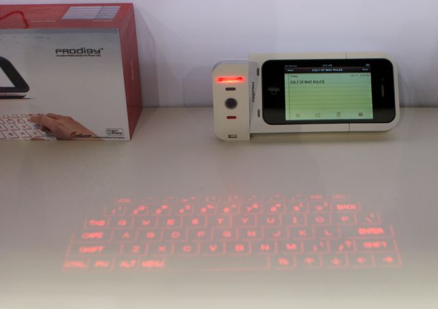 Túto možnosť využila spoločnosť Celluon, ktorá predstavila funkčný prototyp laserovej klávesnice. Celý systém projekcie, je zabudovaný v batériou osadenom obale a presne sedí na modely iPhone 4/4S. Výrobca tvrdí, že interaktívna bezdrôtová klávesnica je funkčná na akomkoľvek povrchu a tiež naznačil, že je schopný do troch mesiacov produkt s názvom Prodigy, dostať na trh za cenu 189,95 dolárov. Osobne si myslím, že ako koncept je to výborná myšlienka, no neviem si predstaviť presnosť zachytávania, pri písaní všetkými desiatimi prstami naraz.