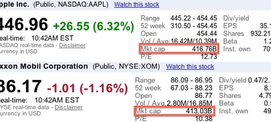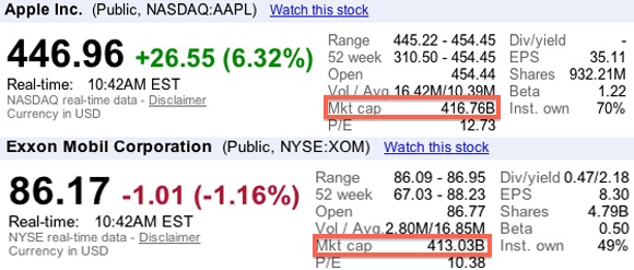 Apple je nejhodnotnější společností světa, alespoň co se Wall Street týká. Hodnota akcií společnosti je 416,76 miliard amerických dolarů. O titul jedničky Wall Street se Apple dlouhodobě přetahuje s těžařskou společností Exxon Mobil Corporation, jejíž akciová hodnota je v současné době 413.03 miliardy amerických dolarů.