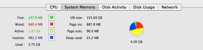 Pro měření aktuálně využité operační paměti slouží aplikace Activity Monitor, kterou naleznete přímo v Mac OS X. Stačí otevřít Applications – Utilities – Activity Monitor. Activity monitor dokáže měřit vytížení operační paměti a její rozdělení mezi jednotlivé aplikace v reálném čase. Jen pro upřesnění doplním, že nemusíte mít obavu z toho, když Activity Monitor naměří při vytížení CPU hodnoty vyšší než 100%. Unixovy operační systém a Activity Monitor dávají 100% výkonu každému jádru procesoru, pokud tedy váš počítač obsahuje čtyři jádra, má maximální výkon procesoru 400%. Operační systém Mac OS X je Unixový systém, který rozlišuje několik druhů paměti.