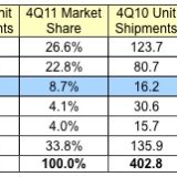 „Apple skočil na tretie miesto v globálnom rozsahu, oproti minuloročnému piatemu miestu, za čo vďačí hlavne rekordnému počtu zásielok v poslednom štvrťroku 2011. To znamená, že spoločnosť z Cupertina je na najvyššom mieste od začiatku uverejňovania rebríčkov IDC, v predaji mobilných telefónov. Uvedenie Apple iPhonu 4S, ktorý je teraz k dispozícii vo viac než 90 krajinách (od polovice januára), sa stalo hlavným dôvodom, prečo spoločnosť preskočila LG a aj ZTE v 4Q11.“
