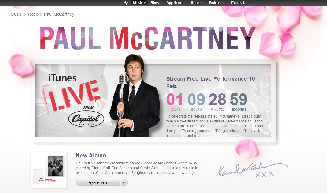 Spoločnosť Apple oznámila, že kvôli podpore nového albumu známeho britského hudobníka, skladateľa, producenta a člena skupiny The Beatles, Paula McCartneyho. Poskytne všetkým používateľom, zdarma živý prenos z jeho koncertu prostredníctvom služby iTunes Live. Keďže koncert sa koná v Capitol Studios v Hollywoode dnes o 19:00, vzhľadom na naše časové pásmo to znamená, že vysielanie sa začne až zajtra 10.januára o 4:00 ráno. Prístup k prenosu tak budú mať všetci používatelia platforiem PC a Mac s nainštalovaným programom iTunes, ale aj majitelia set-top-boxu Apple TV, ktorý si koncert budú môcť vychutnať v plnej kvalite na svojich televíznych obrazovkách. Oficiálne sa na stránkach Applu uvádza:
