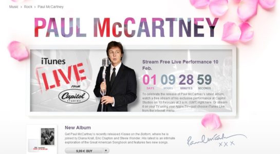 „Na oslavu vydania posledného albumu Paula McCartneyho – ktorý je teraz dispozícii – budeme streamovať jeho exkluzívny výkon, v Capitol Studios 9. februára o 19:00 (PST). Koncert si vychutnáte prostredníctvom iTunes vo vašom počítači, alebo v televízore, pomocou svojej Apple TV – stačí si vybrať iTunes Live z menu Internet.“