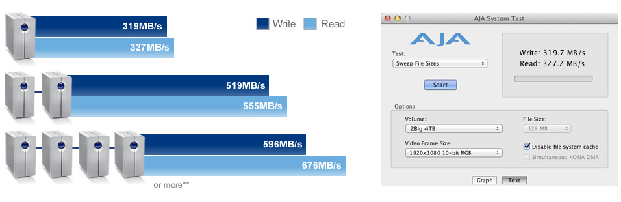 Značka LaCie je známa aj vďaka tomu, že ako prvá prišla s externým pevným diskom označeným ako Little Big Disk, podporujúcim technológiu Thunderbolt. Jeho maximálna kapacita je 2TB, no spomenuté rýchle rozohranie používajú najmä profesionáli, ktorým bola táto veľkosť vo väčšine prípadov nedostatočná. To je už minulosťou, pretože nedávno bol predstavený nový výkonnejší model od LaCie, s označením 2big Thunderbolt. Konkrétne sa jedná o raidové pole s maximálnou kapacitou 8TB, rýchlosťou čítania 327 MB/s a zápisu 319MB/s. Po vzájomnom prepojení viacerých zariadení LaCie 2big však rýchlosť stúpa a spoločnosť uvádza, že spojením štyroch takýchto jednotiek sa dosahuje čítanie až 676MB/s a zápis 596MB/s, čo sú už naozaj vysoké hodnoty.