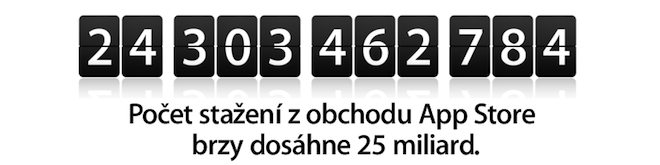 Stáhněte si 25miliardtou aplikaci a můžete vyhrát dárkový poukaz v hodnotě 10 000 dolarů do obchodu App Store. K dnešku bylo celosvětově staženo téměř 25 miliard aplikací. Což je téměř tak úžasné jako stahované aplikace samotné. Proto chceme poděkovat. Stáhněte si 25miliardtou aplikaci a můžete vyhrát dárkový poukaz na App Store v hodnotě 10 000 dolarů.* Stačí navštívit App Store a stáhnout si svou zatím nejlepší aplikaci. Tento text se dnes objevil na internetových stránkách společnosti Apple ve všech zemích světa. Pokud máte zájem, můžete se i vy zúčastnit soutěže o 10 000 dolarů.
