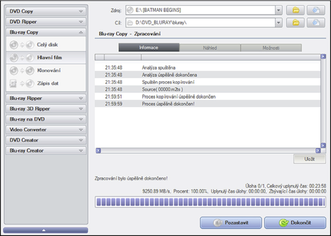 Legislativně ne úplně „košer“, protože při tomto procesu dochází k prolomení ochranného kódu používaného výrobcem originálních BluRay. Film a jeho zvolená zvuková stopa jsou zkopírované, celé to trvalo 24 minut. Přistoupíme ke konvertování do vhodného formátu v rozlišení HD.