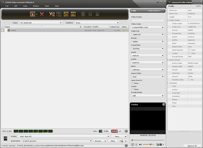 Spustíme ImTOO Converter, zvolíme soubor v adresáři STREAM na HDD a tento se načte a připraví ke konvertování. Poté je nutné zvolit výstupní formát a jeho parametry. Na obrázku je vidět, že bylo zvoleno nastavení pro iPad HD, které bude v rozlišení 1280×720, při bitovém toku 3000 kb/s, zvuk byl ponechán v 48000 s bitovým tokem 128 kb/s – výsledný soubor by měl dosáhnout velikosti kolem 3 Gb. Slušné na film o délce 2h20min. Kratší filmy o stejném nastavení se pak lehce vejdou pod 3 Gb. S iPadem o kapacitě 64 Gb je to slušná hromádka filmů v HD kdekoliv sebou. (Lze zvolit i nižší rozlišení, např. 960×540, při bitovém toku 2000 kb/s a dosáhnout tak výsledné velikosti o cca 2Gb, ale osobně volím vyšší, protože je to prostě lepší)