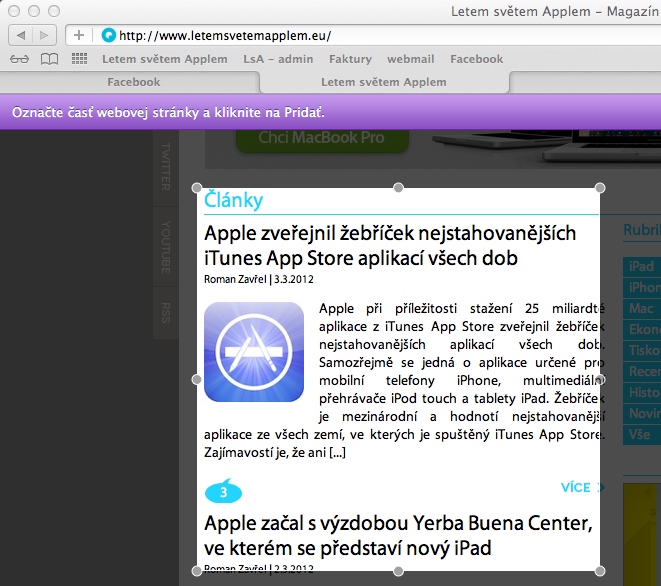 Většina uživatelů Mac OS X se snaží, aby do počítače instalovala co nejméně dalšího software. Apple to samozřejmě ví a snaží se běžným uživatelům poskytnout co nejvíce nástrojů přímo v operačním systému. Pomocí internetového prohlížeče Safari a Dashboardu máte možnost vytvořit pohodlnou RSS čtečku, která zobrazí přesně to co chcete. Většina RSS čteček je závislá na RSS kanálech, které poskytují webové stránky. Je tedy jen na provozovateli webové stránky, co zařadí do RSS kanálu. Mimochodem RSS kanál Letem světem Applem nalezenete přímo zde. Pomocí Dasboardu si však můžete vytvořit čtečku, která zobrazí přesně tu část webové stránky kterou požadujete.