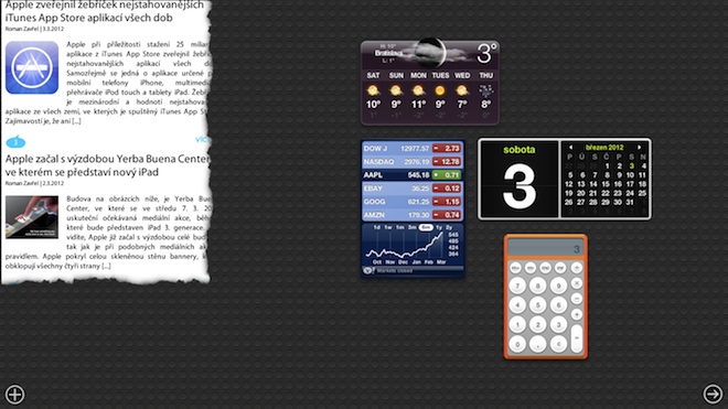 Jakmile vyberete požadovaný výřez webové stránky a zvolíte možnost Potvrdit, objeví se výběr přímo v Dashboardu. Při spuštění Dashnoardu se webové stránky, které v něm máte uloženy automaticky aktualizují, nyní již víte, proč používám pojem RSS čtečka i když se tak úplně o RSS čtečku nejedná. V Dasboardu je načtena celá webová stránka, vidět je však pouze výběr, který jste udělali v Safari. Samozřejmě můžete Widget upravit přesně jak chcete. Stačí zvolit symbol + v levé dolní části obrazovky a následně najet myší na okno webové stránky a zvolit symbol info v levém dolním rohu.