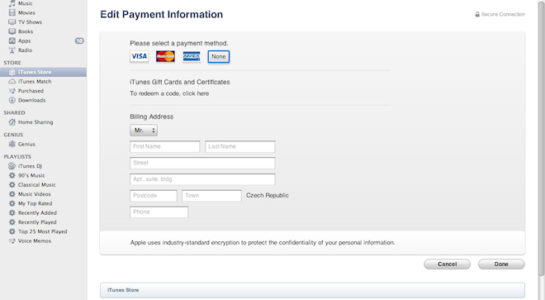 Pokud si chcete být jisti, že vaše karta není v ohrožení, přihlašte se na iTunes Store a zvolte položku Account. Pod položkou Payment Information odstraňte veškeré údaje o platební kartě tím, že zaškrknete položku None. Následně změňte heslo v iTunes Store a do vyřešení situace stahujte pouze bezplatné položky.