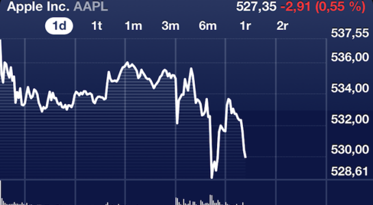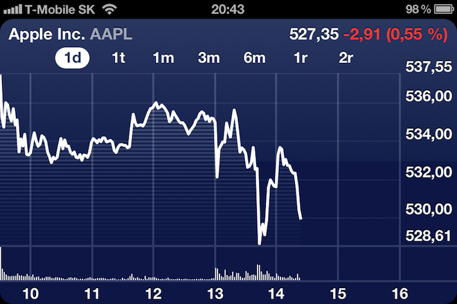 *Hodnota akcii Apple Inc. hodinu po skončení Keynote a představení iPad 3. generace.