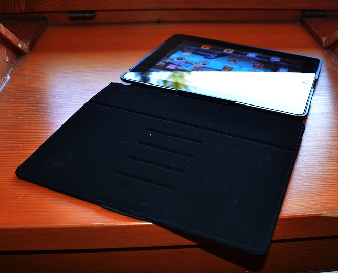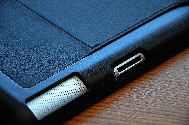 Na prvý pohľad ide o obyčajné kožené puzdro, avšak zadná strana naznačuje nezvyčajnú kombináciu kože a polykarbonátovej škrupiny, do ktorej tablet presne a pevne zapadne. Vyrezané sú v nej otvory na prepnutie do tichého režimu a spánku, ovládanie hlasitosti, kameru, reproduktor, slúchadlá a taktiež na „Dock“ konektor.