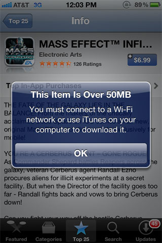Apple zvýšil limit pro stahování aplikací pomocí Over the Air stahování. Nyní můžete prostřednictvím 3G nebo 4G LTE sítí stahovat aplikace až do velikosti 50MB. Do včerejšího dne bylo přitom možné stahovat aplikace s maximální velikostí 20MB. Vývojáři se s tímto limitem v minulosti často potýkali a tvrdili, že pokud aplikace překročí velikost 20MB, snižuje se její šance na koupi.