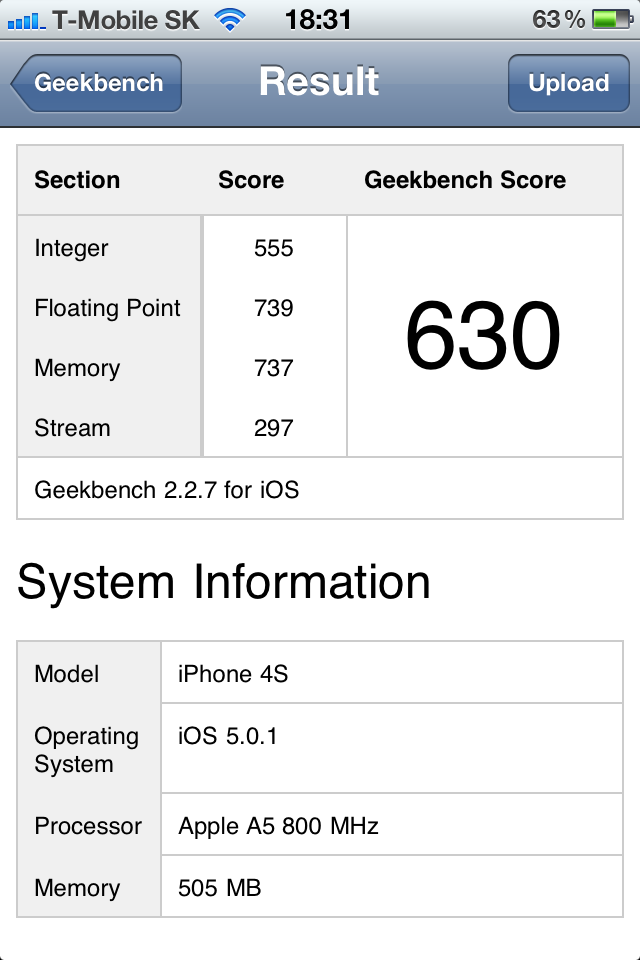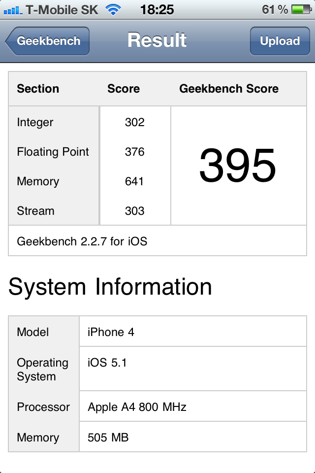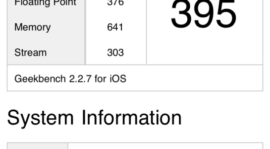 Údaje v systémových informáciách naznačujú použitie 1GB pamäte RAM, čo je dvojnásobná kapacita oproti iPadu 2. Bohužiaľ výsledné skóre sa nedá považovať za správne, pretože podľa neho, by mal nový iPad takmer identický výkon so svojím predchodcom. Dôvodom prečo aplikácia ukazuje chybné hodnoty, je pravdepodobne to, že zatiaľ nie je novinke s čipsetom A5X plne prispôsobená. Každopádne sme skúsili porovnať výkony starších iOS zariadení s novým iPadom.