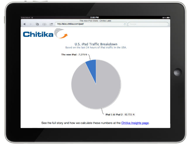 Poslední zprávy, které přicházejí ze sítí amerických mobilních operátorů dokazují, že třetí generace iPadu si velmi rychle vydobyla významný podíl na úkor ostatních iPadů. Nový iPad je v prodeji jen deset dní a již si získal podíl 7,27%. S těmito čísly přišla společnost Chitika Insights, které monitoruje provoz na amerických mobilních sítích. Zbývajících 92,721% patří předchozím dvěma generacím populárního tabletů. Jak je zcela zřejmé, nový iPad si od počátku svých prodejů stabilně získává podíl, který se druhý den po zahájení prodejů vyšplhal na 5% a dosáhl 9,9% v úterý.